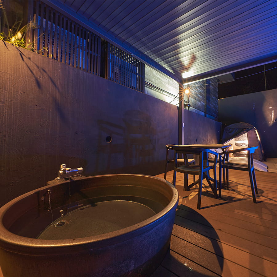 A tent sauna installed on the pool deck. The deck also has an outdoor shower, hot spring open-air bath, and pool, making it a dream-like space. After warming up slowly in the open-air bath, enjoy the sauna, refresh yourself with a shower, and cool down in the pool. Set up with a deck chair. It's your own space where no one will disturb you, so you can spend as much time as you like.